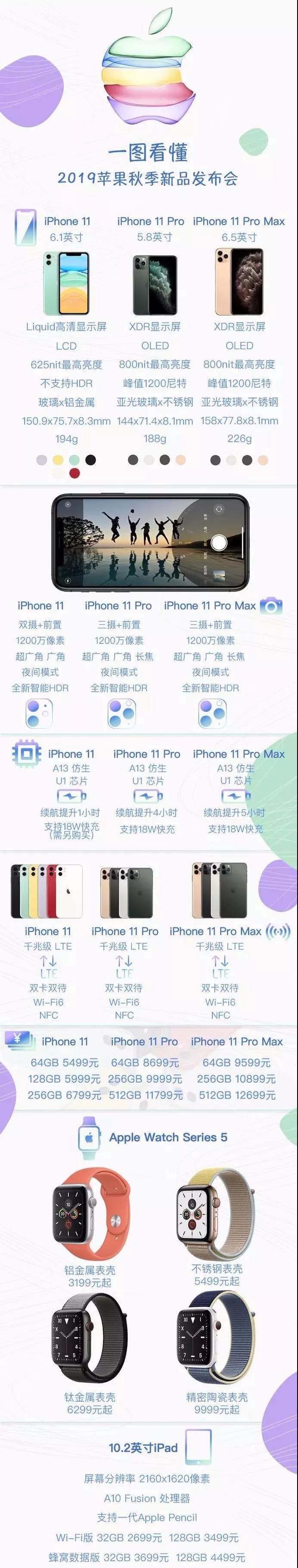 不出所料,新iPhone分為iPhone 11、iPhone 11 Pro和iPhone 11 Pro Max幾個系列,分別擁有雙攝和三攝系統(tǒng),增加了綠色等新配色,續(xù)航能力也各自有所提升。此前傳言的反向充電、支持Apple Pencil等功能則并未出現(xiàn)。