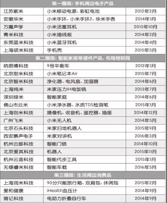 第二圈層是智能硬件,小米投資孵化了多個(gè)領(lǐng)域的智能硬件產(chǎn)品,如空氣凈化器、凈水器、電飯煲等傳統(tǒng)白電的智能化;也投資孵化了無人機(jī)、平衡車、機(jī)器人等極客互融類智能玩具。2014?2016年的三年,小米先后投資了27/28/22個(gè)智能硬件生產(chǎn)企業(yè),相當(dāng)于15天就投資一家,為其物聯(lián)網(wǎng)布局完善智能硬件產(chǎn)品系列。