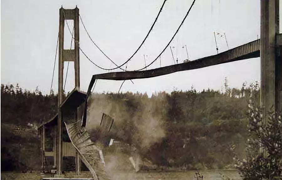 吊橋于 1940 年 7 月 1 日通車,但每當起風時,橋梁在共振頻率的驅動下會產生不可控的振蕩和扭轉,僅僅過了四個月,這座 200 米長的橋從中部斷開,倒塌了。