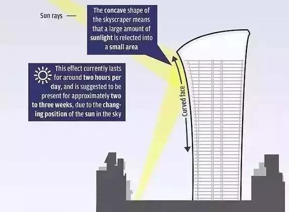 更糟糕的是,大樓的鏡面設計將太陽光反射到對面的街道上,致使眾多商家的店鋪內出現(xiàn)油漆起泡融化、瓷磚破裂,地毯被燒焦等情況,甚至把停在街邊的汽車都照熔化了。