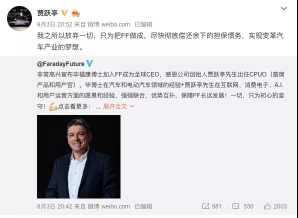 賈躍亭最新一條微博仍停留在9月3日,“我之所以放棄一切,只為把FF做成,盡快徹底償還余下的擔(dān)保債務(wù),實現(xiàn)變革汽車產(chǎn)業(yè)的夢想?!?。