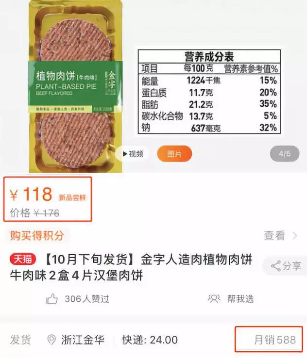 目前,金字火腿生產(chǎn)的人造肉產(chǎn)品目前已在其天貓旗艦店預(yù)售,并顯示將于10月下旬發(fā)貨。產(chǎn)品介紹欄顯示,上述人造肉餅以大豆等植物蛋白制成,有牛肉質(zhì)感和口感,被定位為健身達(dá)人、素食主義、養(yǎng)生人群的輕食好伴侶。