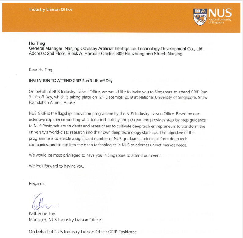 由新加坡國立大學逸夫基金校友會舉辦的GRIP Run 3 Lift-off Day將于12月12日舉行,南京奧特賽人工智能技術研發(fā)有限公司總經理胡婷女士受邀參加賽事。