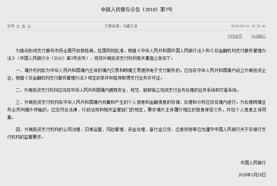 2018年3月,央行發(fā)布《中國(guó)人民銀行公告〔2018〕第7號(hào)》,開(kāi)放外商投資支付機(jī)構(gòu),明確外商投資支付機(jī)構(gòu)準(zhǔn)入條件和監(jiān)管要求。Paypal收購(gòu)國(guó)付寶為該公告發(fā)布后第一家進(jìn)入我國(guó)內(nèi)地市場(chǎng)的外資支付機(jī)構(gòu)。