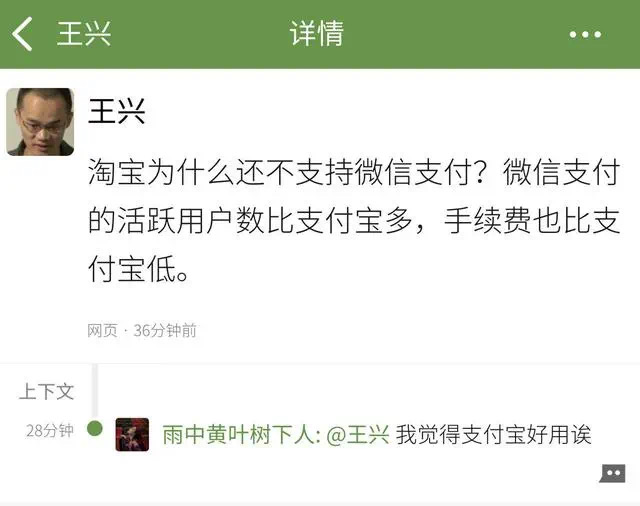 當(dāng)天晚間,據(jù)媒體報(bào)道,美團(tuán)創(chuàng)始人、CEO王興在某社交平臺上稱:“淘寶為什么還不支持微信支付?微信支付的活躍用戶數(shù)比支付寶多,手續(xù)費(fèi)也比支付寶低。”