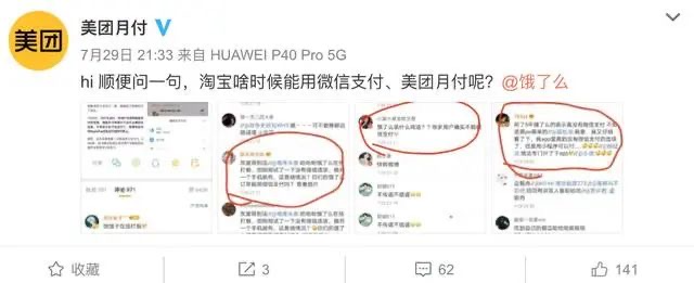 對此,美團(tuán)月付再發(fā)微博做出回?fù)簦骸癶i,順便問一句,淘寶啥時(shí)候能用微信支付、美團(tuán)月付呢?”