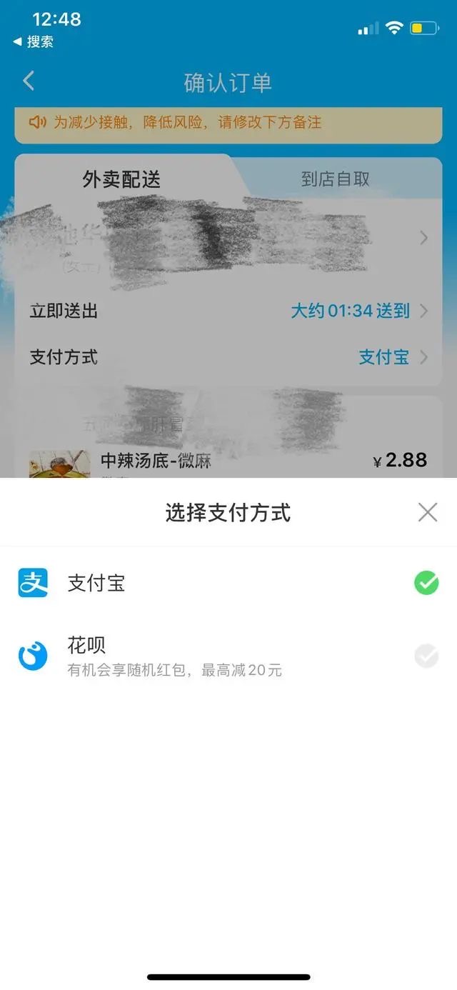 餓了么是先選擇支付方式再完成下單,使用的餓了么App顯示只有支付寶和花唄兩種選項(xiàng)。