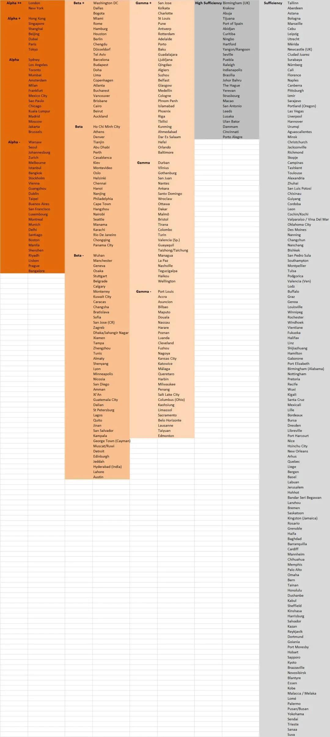 其中,Alpha、Beta、Gamma三個(gè)等級(jí)由于是榜單中的核心關(guān)鍵,又進(jìn)一步被細(xì)分為:Alpha++(一線超強(qiáng)城市)、Alpha+(一線強(qiáng)城市)、Alpha(一線城市)、Alpha-(一線弱城市);Beta+(二線強(qiáng)城市)、Beta(二線城市)、Beta-(二線弱城市);Gamma+(三線強(qiáng)城市)、Gamma(三線城市)、Gamma-(三線弱城市)。