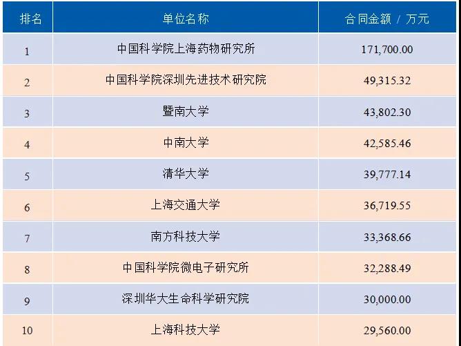 2019年高校院所以轉(zhuǎn)讓、許可、作價(jià)投資3種方式轉(zhuǎn)化科技成果合同金額前10名