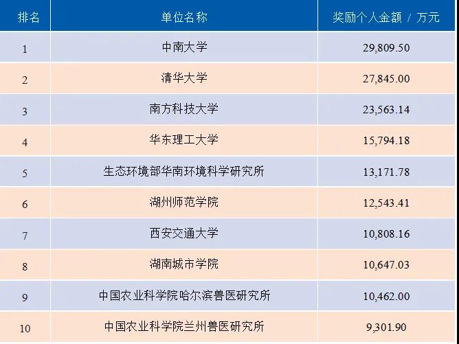 2019年高校院所獎(jiǎng)勵(lì)個(gè)人現(xiàn)金和股份總金額前10名