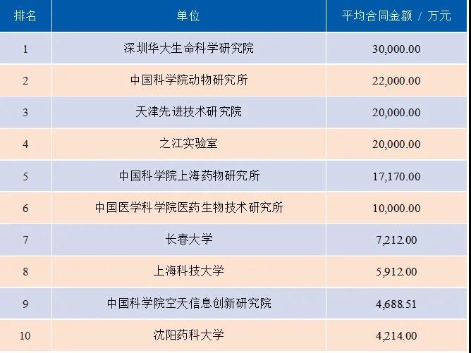 2019年高校院所以轉(zhuǎn)讓、許可、作價(jià)投資方式轉(zhuǎn)化科技成果的平均合同金額排名前10名