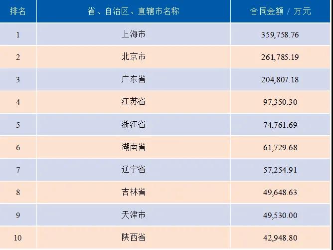 2019 年各地方轄區(qū)內(nèi)的高校院所以轉(zhuǎn)讓、許可、作價(jià)投資方式轉(zhuǎn)化科技成果的合同金額前10名
