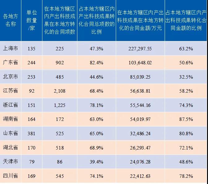 2019年各地方轄區(qū)內(nèi)產(chǎn)出科技成果轉(zhuǎn)化至本地方的合同項(xiàng)數(shù)與合同金額前10名情況