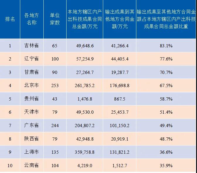 2019年各地方轄區(qū)內(nèi)產(chǎn)出科技成果輸出至其他地方合同金額占合同總金額比重前10名的相關(guān)情況