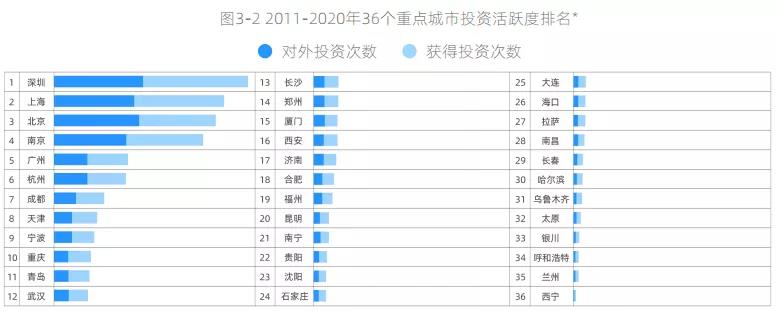 城市投資活躍度,是以該城市參與的投資事件(對外投資次數(shù)+獲得投資次數(shù))總和來排序。