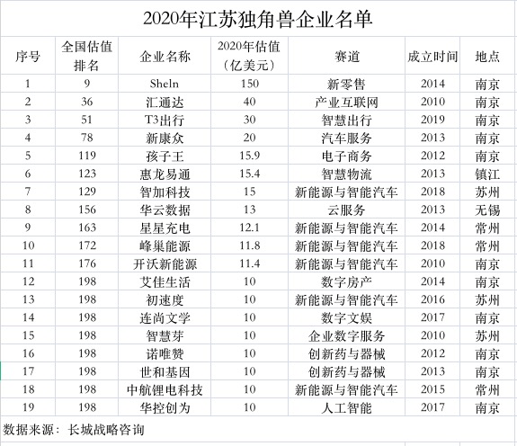 2020年江蘇新晉為獨(dú)角獸企業(yè)并同年上市企業(yè)名單