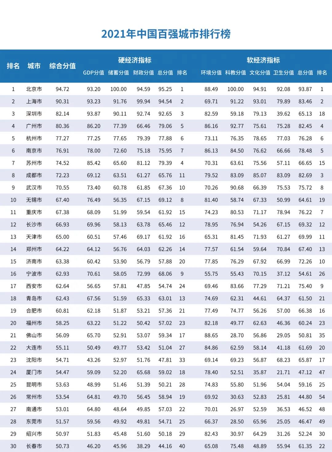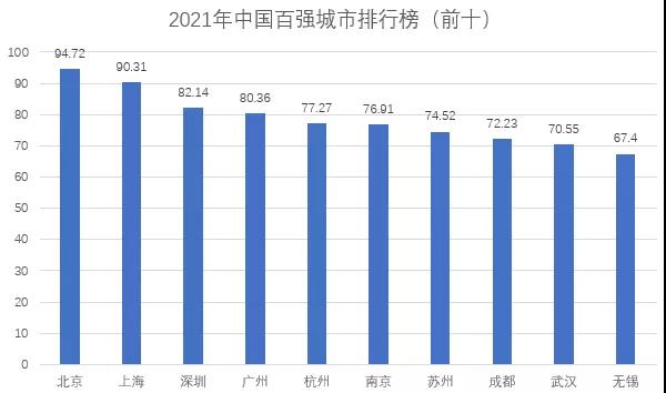 在“2021年中國百強城市排行榜”上,北京、上海高居前兩位,綜合分值分別為94.72和90.31。位居第三至第十位的依次是深圳(82.14)、廣州(80.36)、杭州(77.27)、南京(76.91)、蘇州(74.52)、成都(72.23)、武漢(70.55)和無錫(67.40)。