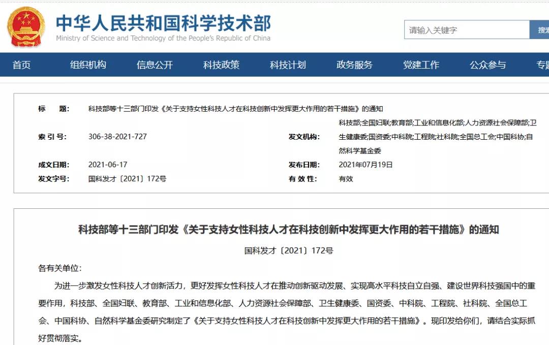 科技部等十三部門(mén)印發(fā)《關(guān)于支持女性科技人才在科技創(chuàng)新中發(fā)揮更大作用的若干措施》的通知