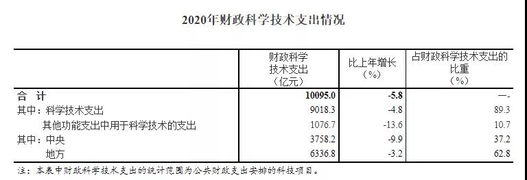 《公報(bào)》指出,2020年,國(guó)家財(cái)政科學(xué)技術(shù)支出10095.0億元,比上年減少622.4億元,下降5.8%。其中: