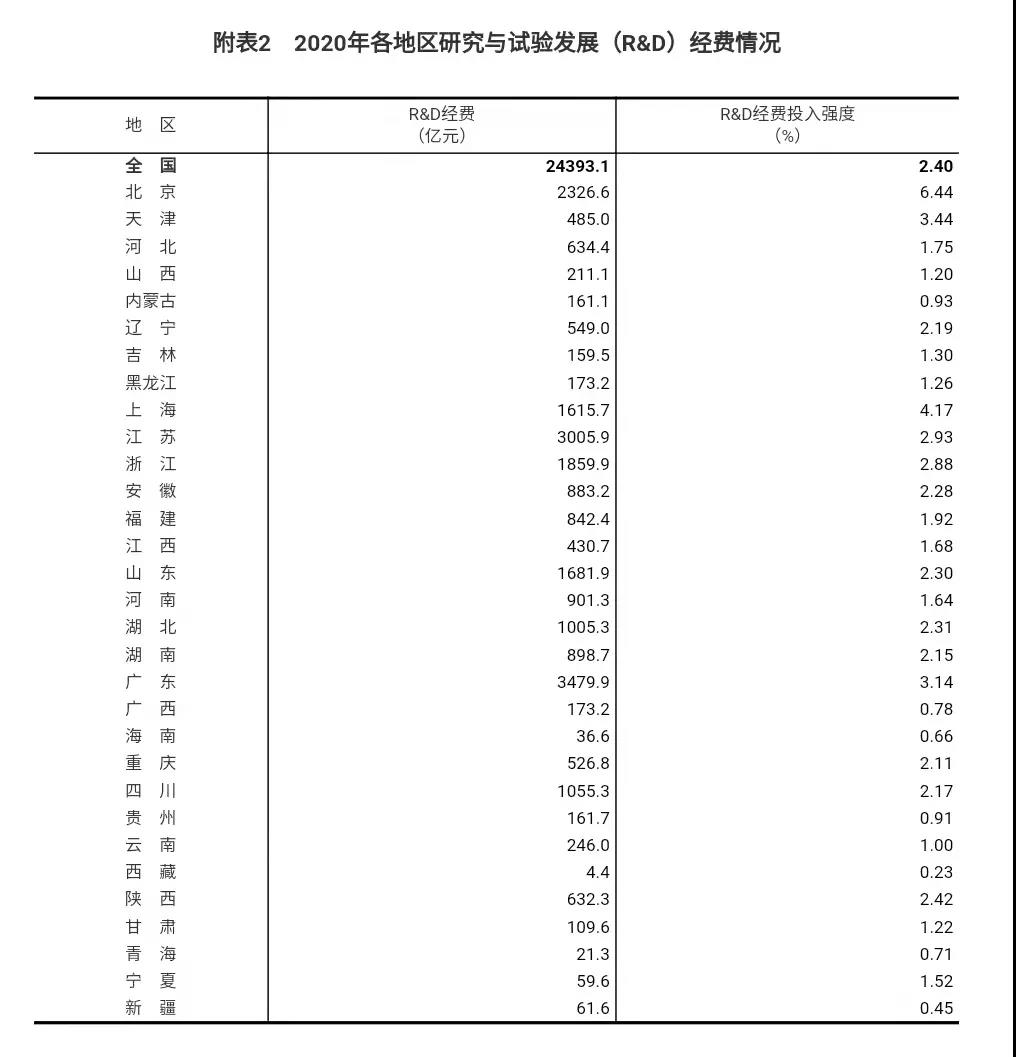9月22日,國(guó)家統(tǒng)計(jì)局、科技部、財(cái)政部聯(lián)合發(fā)布《2020年全國(guó)科技經(jīng)費(fèi)投入統(tǒng)計(jì)公報(bào)》(以下簡(jiǎn)稱《公報(bào)》),2020年,全國(guó)共投入研究與試驗(yàn)發(fā)展(R&D)經(jīng)費(fèi)24393.1億元,比上年增加2249.5億元,增長(zhǎng)10.2%,增速比上年回落2.3個(gè)百分點(diǎn);研究與試驗(yàn)發(fā)展(R&D)經(jīng)費(fèi)投入強(qiáng)度(與國(guó)內(nèi)生產(chǎn)總值之比)為2.40%,比上年提高0.16個(gè)百分點(diǎn)。按研究與試驗(yàn)發(fā)展(R&D)人員全時(shí)工作量計(jì)算的人均經(jīng)費(fèi)為46.6萬(wàn)元,比上年增加0.5萬(wàn)元。
