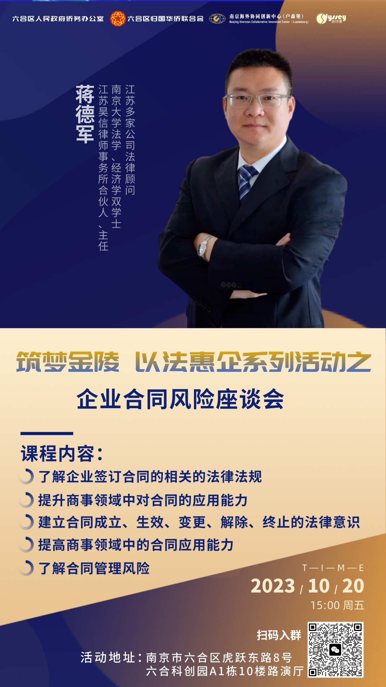 為了幫助企業(yè)了解基本的合同知識(shí),以便在商業(yè)活動(dòng)中保護(hù)自己的合法權(quán)益,規(guī)避相關(guān)法律風(fēng)險(xiǎn),由六合區(qū)人民政府僑務(wù)辦公室、六合區(qū)歸國華僑聯(lián)合會(huì)協(xié)同南京海外協(xié)同創(chuàng)新中心(盧森堡)以及奧特賽空間向企業(yè)特別推出筑夢(mèng)金陵以法惠企系列活動(dòng)——企業(yè)合同風(fēng)險(xiǎn)座談會(huì)幫助企業(yè)提高商業(yè)談判能力、對(duì)合同條款的理解能力、合理判斷條款內(nèi)容等。