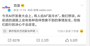 7月3日晚,百度在社交網(wǎng)站上發(fā)布潑水事件發(fā)表正式回應(yīng)“針對(duì)今天在AI開(kāi)發(fā)者大會(huì)現(xiàn)場(chǎng)的時(shí)間,我們感到憤怒,并強(qiáng)烈譴責(zé)肇事者的行為!”“AI前進(jìn)的道路上有著各種各樣意想不到的事情發(fā)生,但我們前行的決心不會(huì)改變?!?/span>