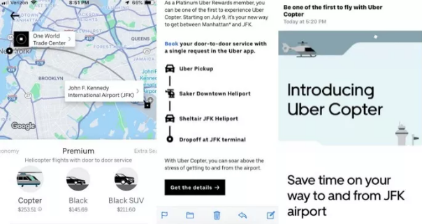 據(jù)CNN報(bào)道,Uber在紐約正式上線Uber Copter(優(yōu)步直升機(jī))試點(diǎn)服務(wù),白金和鉆石用戶可以預(yù)約從曼哈頓下城到肯尼迪國際機(jī)場的直升機(jī),全程僅需8分鐘(在交通不擁堵的情況下乘車需半小時(shí)以上),單程票價(jià)約200美元。一架Uber Copter可以容納4至5人,每位乘客可攜帶一個(gè)登機(jī)箱和一個(gè)手提包,前往機(jī)場的旅客可以在當(dāng)天或最多提前5天預(yù)定。