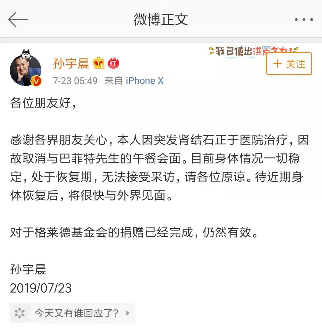 而在7月23日早晨,孫宇晨發(fā)微博稱由于“突發(fā)腎結(jié)石”、“取消與巴菲特先生的午餐會(huì)面”。當(dāng)天,網(wǎng)上對(duì)此猜測(cè)紛紛,有人祝福早日康復(fù),但也有不少人表示,“真巧!”。